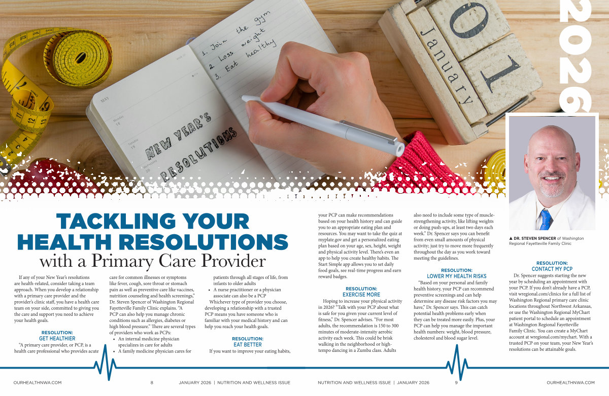 Dr. Spencer suggests starting the new year by scheduling an appointment with your PCP. If you don’ t already have a PCP, visit wregional. com / clinics for a full list of Washington Regional primary care clinic locations throughout Northwest Arkansas, or use the Washington Regional MyChart patient portal to schedule an appointment at Washington Regional Fayetteville Family Clinic. You can create a MyChart account at wregional. com / mychart. With a trusted PCP on your team, your New Year’ s resolutions can be attainable goals.